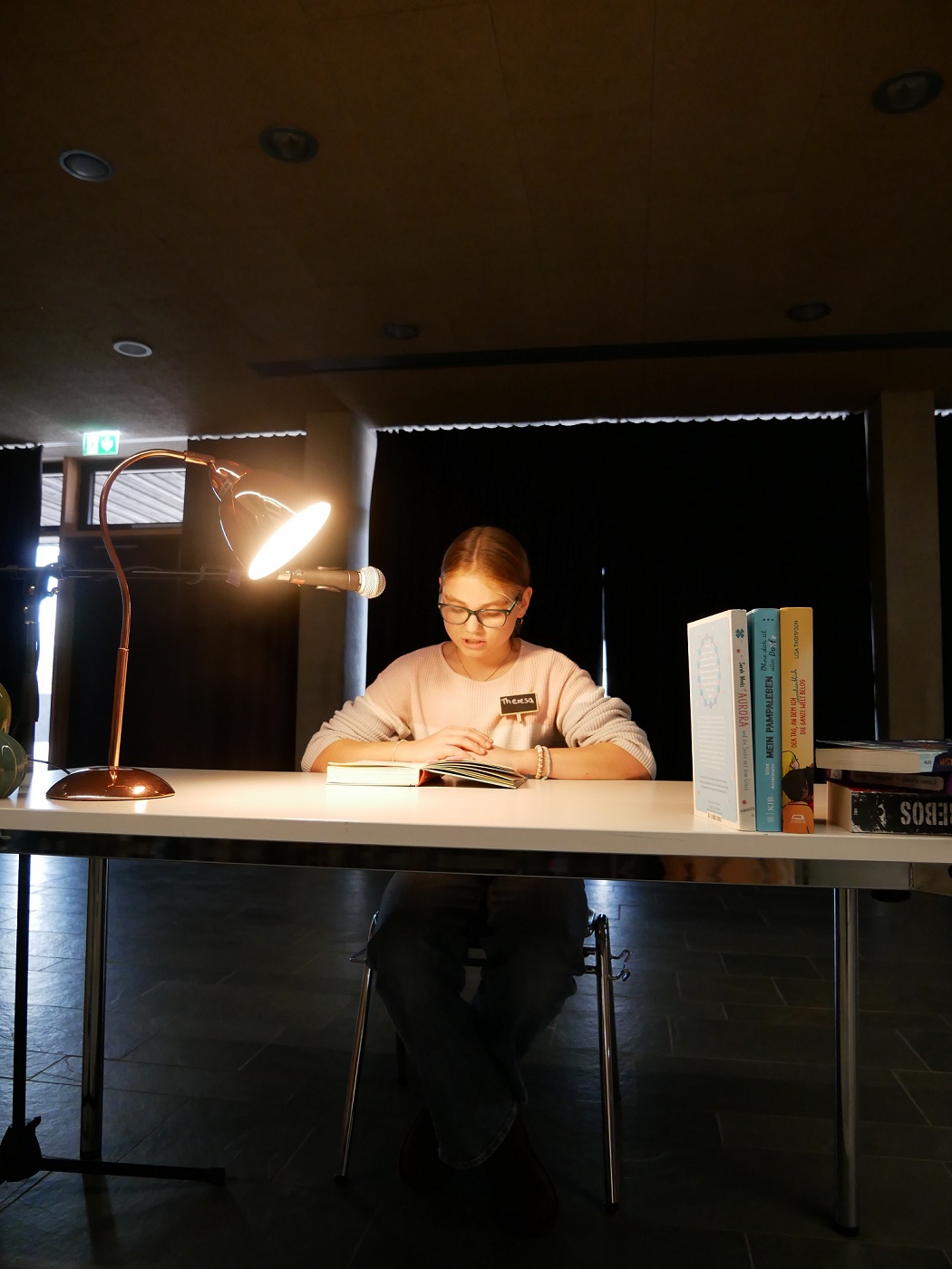 Die Leser mussten zuerst ihren ausgewählten Teil vorlesen und ihre Bücher präsentieren. Während der ersten Pause weihte Herr Bräu alle anwesenden Schüler auf eine amüsante Weise in alle Facetten des Poetry Slams ein und stellte mit Amira gleich eine Slammerin aus der 9. Klasse vor, die mit ihrem Text alle begeisterte. Jetzt aber ging es für die besten Leser der Schüler ans Eingemachte. Alle mussten eine unbekannte Stelle aus einem vorgegeben Kinderbuch vorlesen. Auch wenn Herr Havelka am Ende eine klare Siegerin genau hier küren wollte: So ganz sahen nicht alle im Raum die Siegerin wirklich auf Platz 1. Natürlich gilt Fehlerfreiheit als wichtigstes Argument, aber Betonung und Natürlichkeit sollten das auch. Alle diese Attribute brachte Theresa mit sich, auch wenn sie nicht ganz fehlerfrei las, am Ende aber nur auf dem 4. Platz landete. Generell kann man sagen: Es herrschte ein hohes Niveau beim diesjährigen Wettbewerb. Vielleicht lag es auch daran, dass nur Mädchen vertreten waren? Die Buben hielten sich auf alle Fälle zurück.