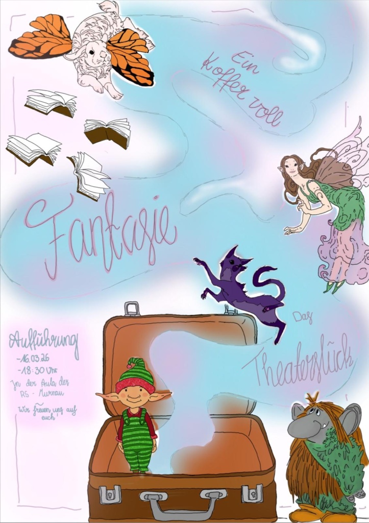 Als Direktorin Kühn auf die Bühne kommt, herrscht in der Aula plötzlich Stille. Ein bestimmender Ton erfüllt das Publikum und den Rest der Schauspieler. Sie ist es, die für Ordnung sorgen will und auch dafür, dass die Kinder Ida, Marie, Sophie, Romina, Apolonia, Chloé, Isabella und Mia wieder auf den rechten Weg kommen – weg von den Träumen hin zur Realität. So mancher im Saal wird sich an seine eigene Schulrealität erinnert haben, andere wurde der Spiegel vorgehalten und jene, die aktuell SchülerInnen sind, haben wohl gedacht: Genau so läuft es gerade. Vor allem aus inhaltlicher Sicht hatte das Theaterstück „Ein Koffer voll Fantasie“, das die Theatergruppe der Realschule Murnau unter Leitung von Betreuungslehrerin Nadine Eisenmann 2026 auf die Bühne brachte, ganz schön viel Tiefgang und vor allem Schülerbezug, obwohl die eigentliche Dramaturgie des Stücks keine große Komplexität aufwies.