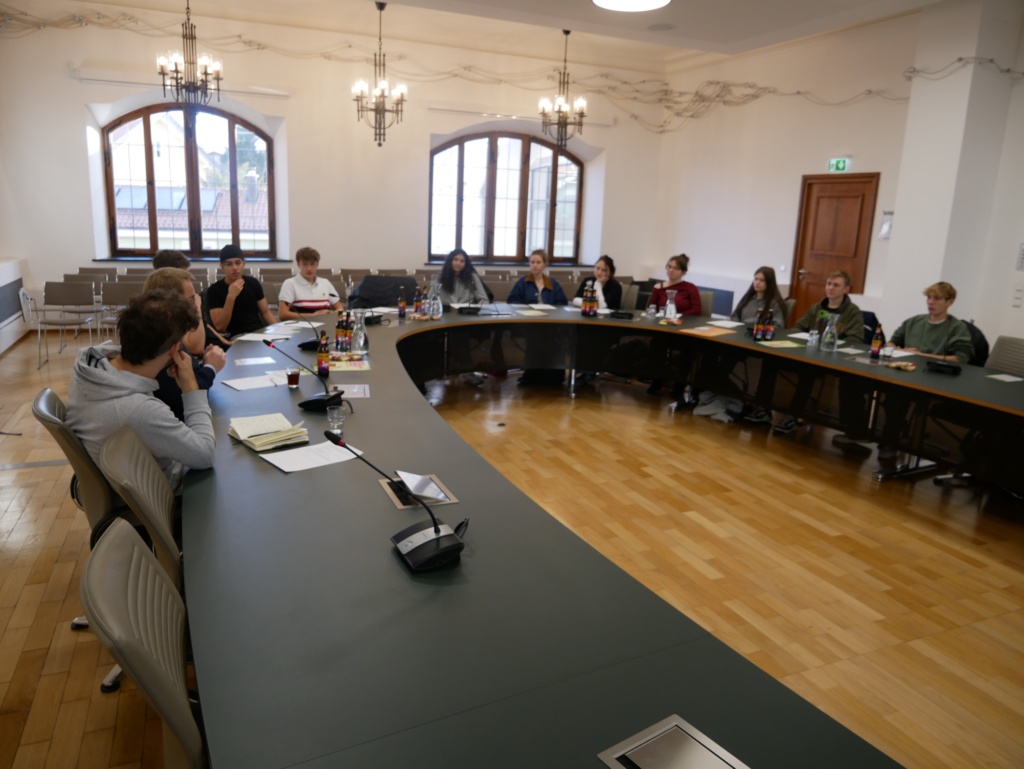 Der zweite Gesprächstermin wurde nun wirklich vom Murnauer Rathaus initiiert. Mit dabei: Ausgewählte SchülerInnen der 10a, die sich im Vorfeld bereits mit bestimmten jugendrelevanten Themen beschäftigt hatten und diese nun in 90 Minuten persönlich dem Bürgermeister vor Ort, genauer: im Sitzungssaal des Rathauses, vortragen durften. Am Ende wurden bereits Termine mit den Jugendlichen ausgemacht, um bestimmte Projekte weiter zu diskutieren. Wir geben euch einen Überblick zu den verschiedenen Tagesordnungspunkten.
